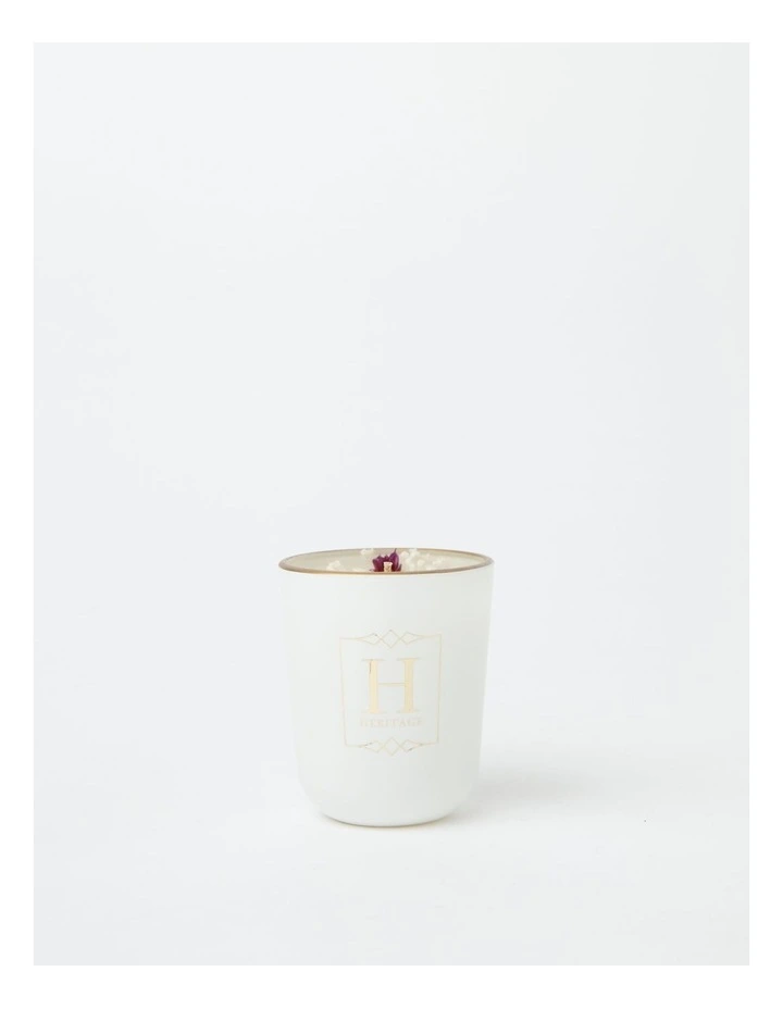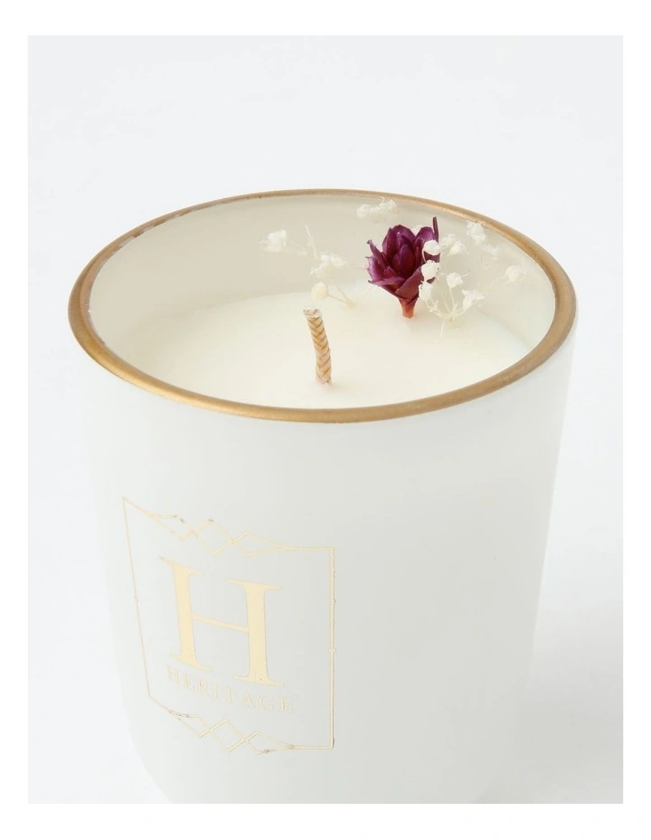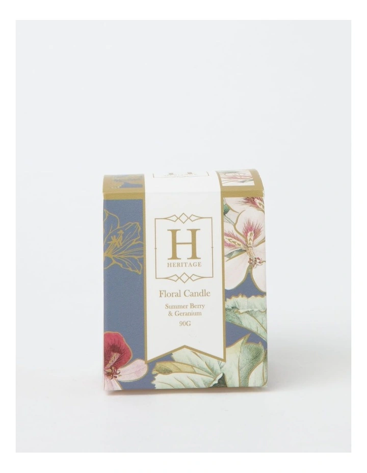 Freshly picked summer berries with a splash of vanilla in a field of wild geraniums. Delight your senses with this refreshing blend of tropical fruits and florals. Beautifully delicate yet sweet as nectar, this fresh fragrance will transform your home into an exotic paradise. Bring a touch of luxury to your home with the beautiful ambience of a Floral Candle by Heritage. Timeless and elegant, each candle is specially curated to elevate any space and create an unforgettable aromatic experience.Â