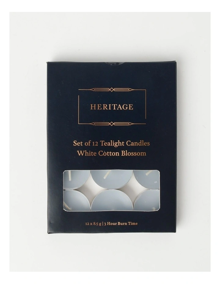 Heritage Set of 12 White Cotton Blossom Scented Tealight Candles in Grey
